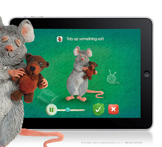 Some of the Task illustration screens for the Tidy-Up iPad app by JollyWombat. They are the new publishers of iPad apps for children. I got to design the look of the app, with many screen illustrations, character designs, environment design, main game characters and the basic design elements like icons, buttons etc.